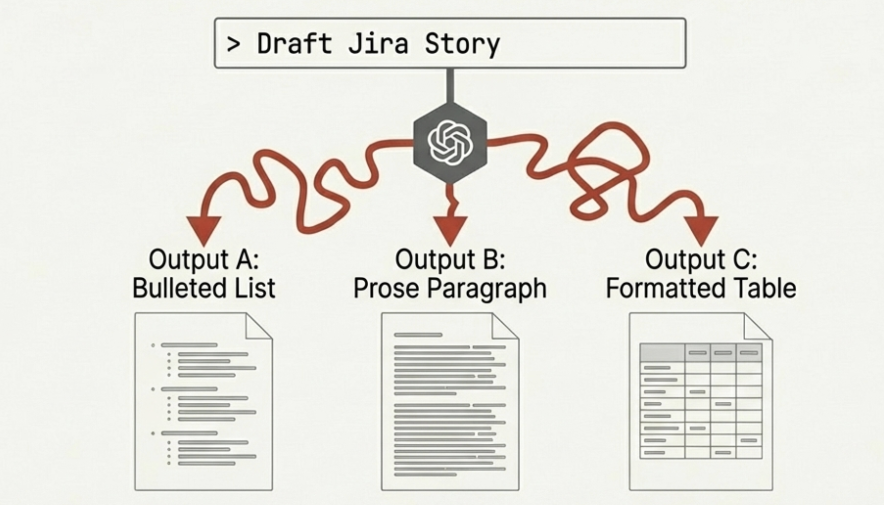 不一致是第一道裂縫。每次輸出的格式都不一樣。LLM 本質上是個隨機過程——同樣的 prompt、同樣的輸入,每次產出不同的結果。當你想在團隊工作流程裡建立在這個基礎上,「每次都不一樣」不是功能,是稅。