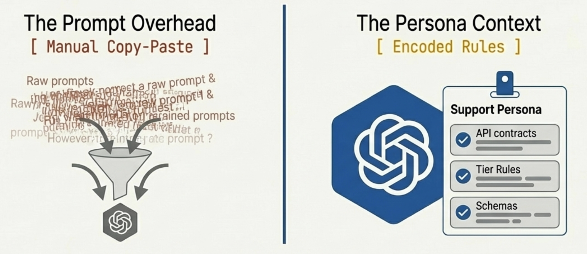 我建了好幾個。一個 database migration 專用的 persona,熟悉我們的 schema 慣例。一個 support case 分析的 persona,知道我們的產品層級和常見故障模式。一個架構設計的 persona,裝載了我們的 service map 和 API 合約。一致性進步了——support persona 每次都會產出有 acceptance criteria 的 Jira story,因為我告訴它要這樣做。Prompt 消失了,取而代之的是更持久的東西,算有點進步。
