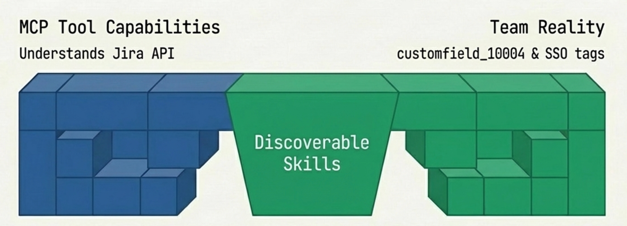 MCP 讓 AI 可以使用工具。但它沒有讓 AI 知道你的團隊怎麼使用這些工具。我們團隊對 SSO 子系統有特定的 component tag。我們對來自 support case 的 story 和來自內部規劃的 story 有不同的命名慣例。Story point 欄位是 customfield_10004,不是每個 LLM 第一次都會猜的那個比較直覺的欄位名。