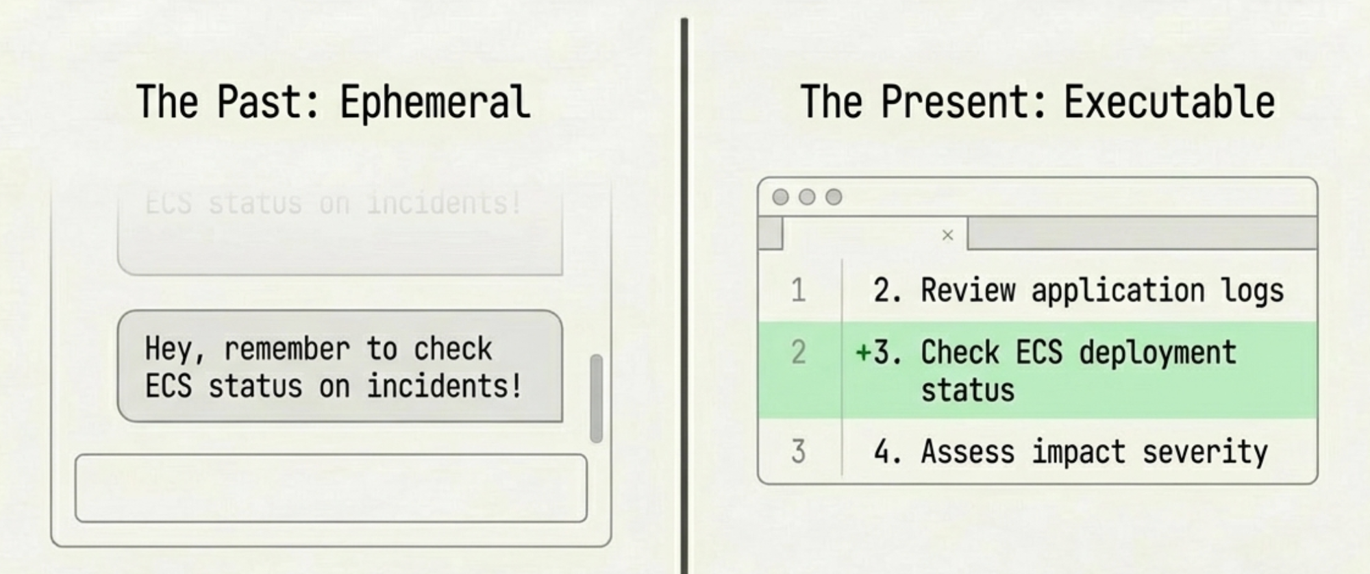 我的 prompt 收藏夾消失了。不是被刪除——是被遺棄。複製貼上成為時代的化石。裡面的知識已經遷移到 commit 進 repository 的 skill 裡,agent 可以發現它們,每一次 incident 和 sprint 都在改善它們。全團隊用同一套 skill,當其中一個人教了 skill 新東西,下一次執行所有人都受益。
