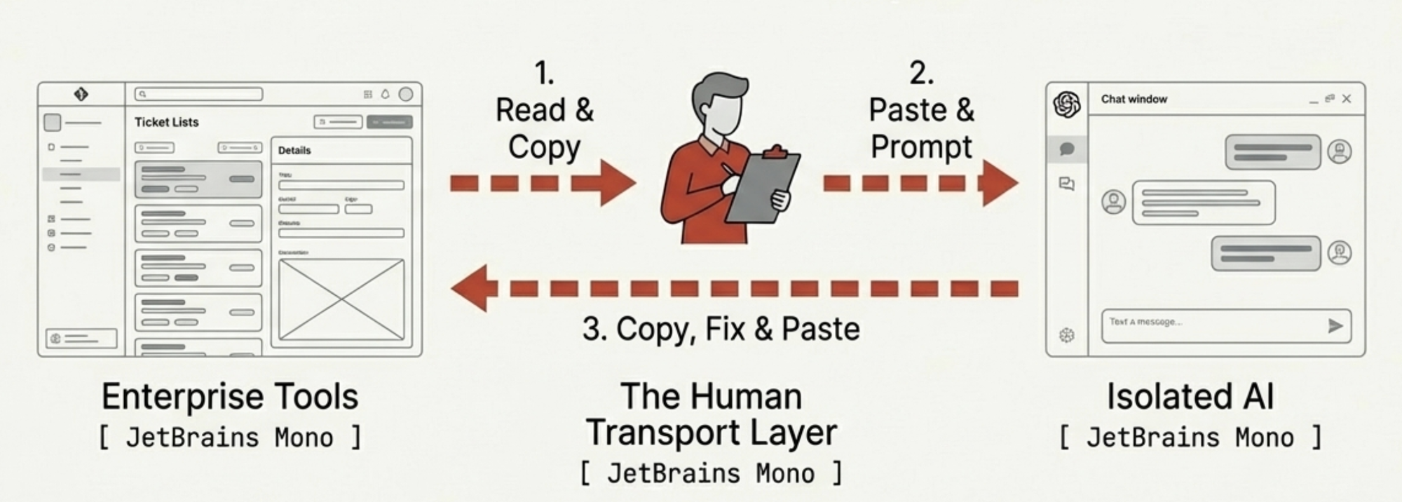但根本的拓撲沒有變。我還是那個 transport layer。把 Zendesk ticket 複製進 support persona,讀輸出,複製進 Jira。AI 更聰明也更一致了,但它還是在聊天視窗裡,而我還是那個在聊天視窗和現實之間搬運資料的人。