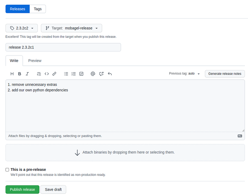 custom-releasebranch as target branch. - Fill in the release title and release message and click publish release. Then, your image build will be triggered automatically (you may view build status from repository page > Actions).