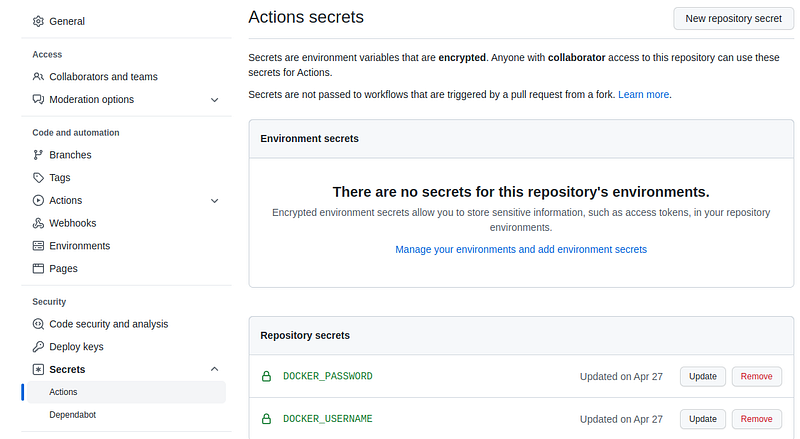 - In the login step, we need to provide our Docker hub login username and password. We put these variable as GitHub secret. You can go to GitHub repository page > Settings > Secrets > Action to add your secret.