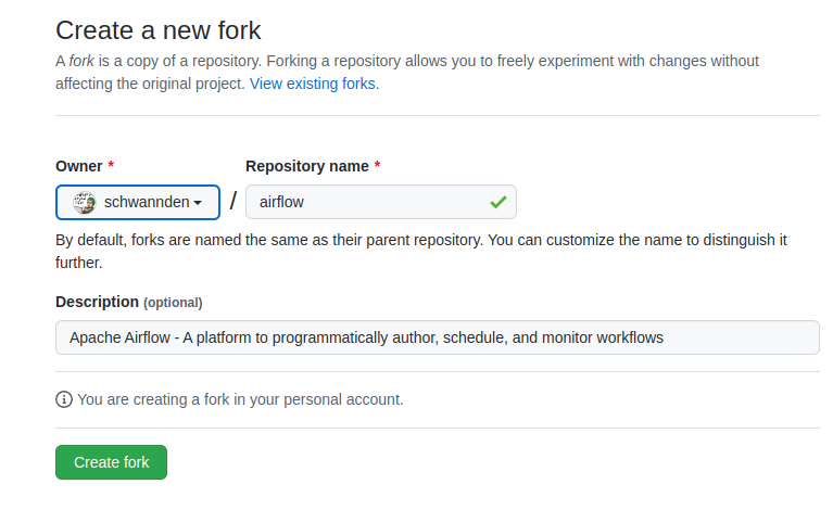 Now, you may go to airflow’s official repository, and fork the official repository to your organization/account.