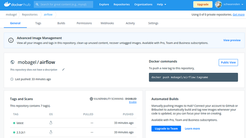 - Hosting repositories on GitHub or Docker Hub and using their free service sounds good. But for enterprises, the issue has always been whether we can open source these code. Since Airflow itself is already open sourced, and it is generally not too much of an issue to reveal our Airflow dependencies, the whole solution of building and hosting Airflow is quite acceptable. If your company is customizing Airflow in a way that would reveal business secret or introduce security concerns, you’ll need to consider a private approach of your own.