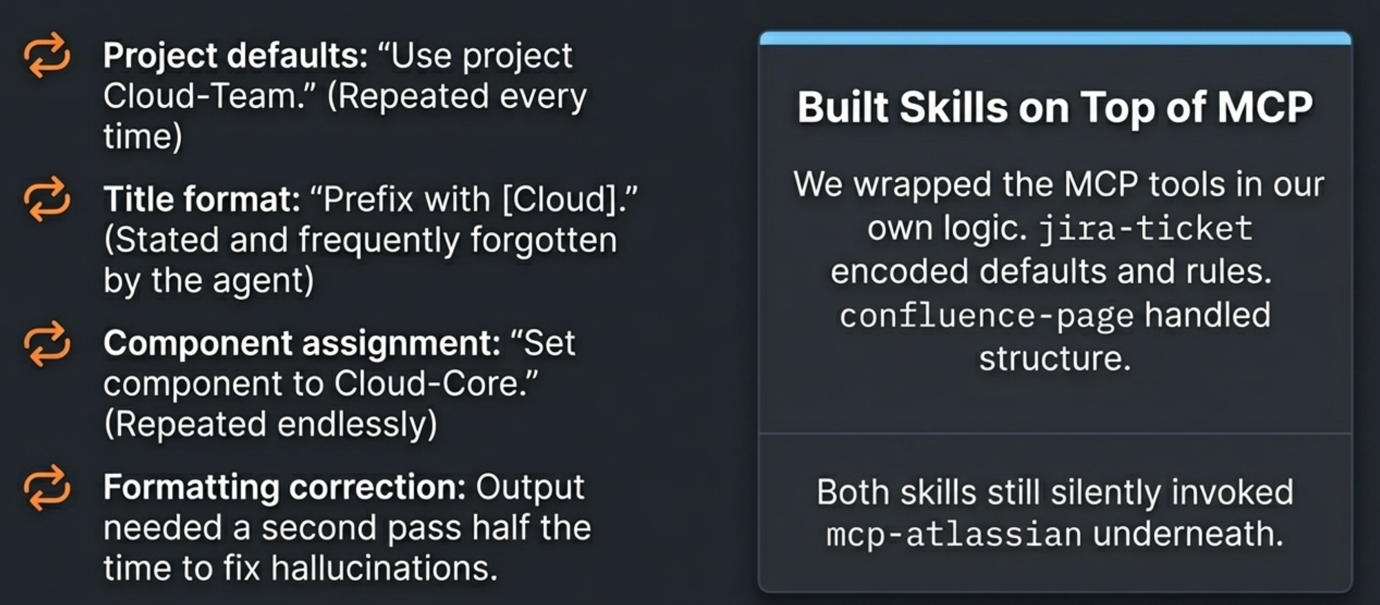 So we built skills on top. A jira-ticket skill that encoded our project defaults, title conventions, component assignments, and custom field handling. A confluence-page skill that knew our space structure and formatting standards. These skills invoked the MCP tools underneath -- jira_create_issue, jira_update_issue, confluence_create_page -- but wrapped them in our team's specific logic.
