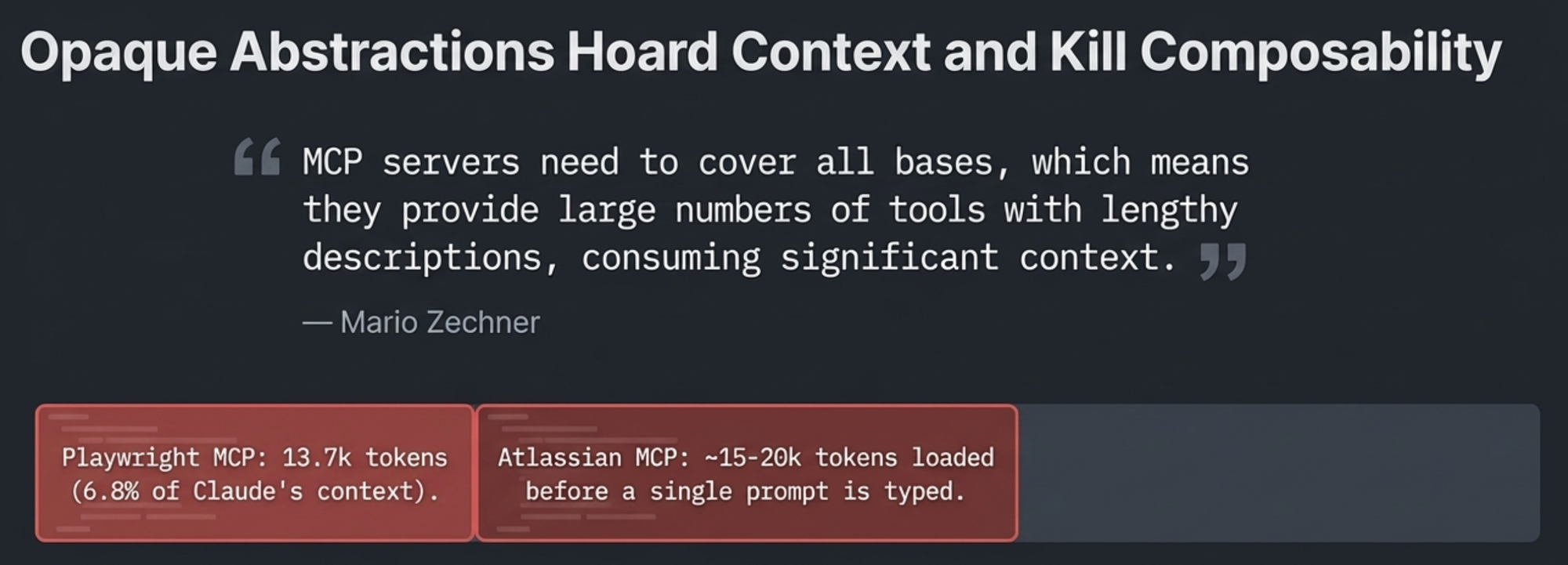 We weren't just paying context overhead. We were paying maintenance overhead, debugging overhead, upgrade-compatibility overhead, and extensibility overhead – all to rent an abstraction that was hiding its own bugs from us, whose outputs weren't composable, and whose tool schemas consumed context whether we used them or not.
