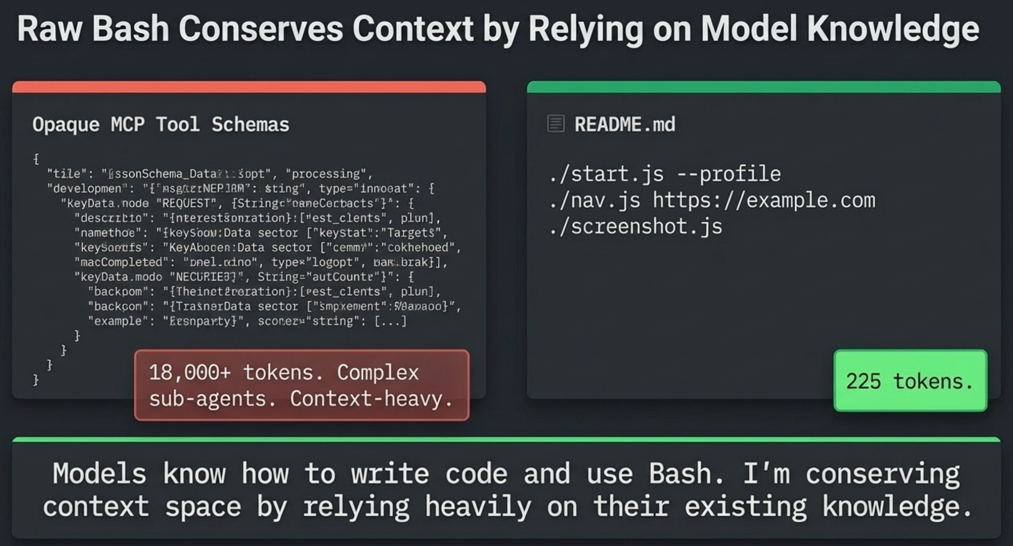 His solution was minimal bash scripts documented in a README. The agent reads the README, understands the tools, calls them directly. His browser toolkit went from thousands of tokens of tool schemas down to 225 tokens of documentation. And the key insight behind the savings: "This efficiency comes from the fact that models know how to write code and use Bash. I'm conserving context space by relying heavily on their existing knowledge." You don't need a tool schema to teach Claude how to make an HTTP request. Claude already knows curl. What it needs is the authentication pattern and the endpoint structure -- documentation, not abstraction.