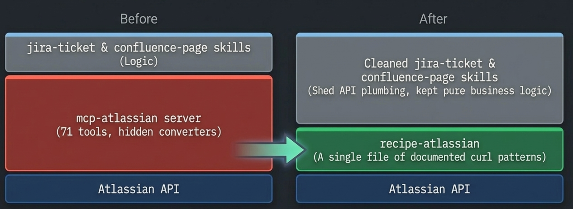 But the number I care about most is the last one. We will never again have a dependency upgrade break our team's workflow. The curl patterns in our recipe skill talk directly to Atlassian's REST API. If Atlassian changes an endpoint, we update one line in one file. No waiting for an MCP maintainer to ship a fix. No hoping the fix doesn't introduce new converter bugs. No rewriting our workflow skills because tool names changed.
