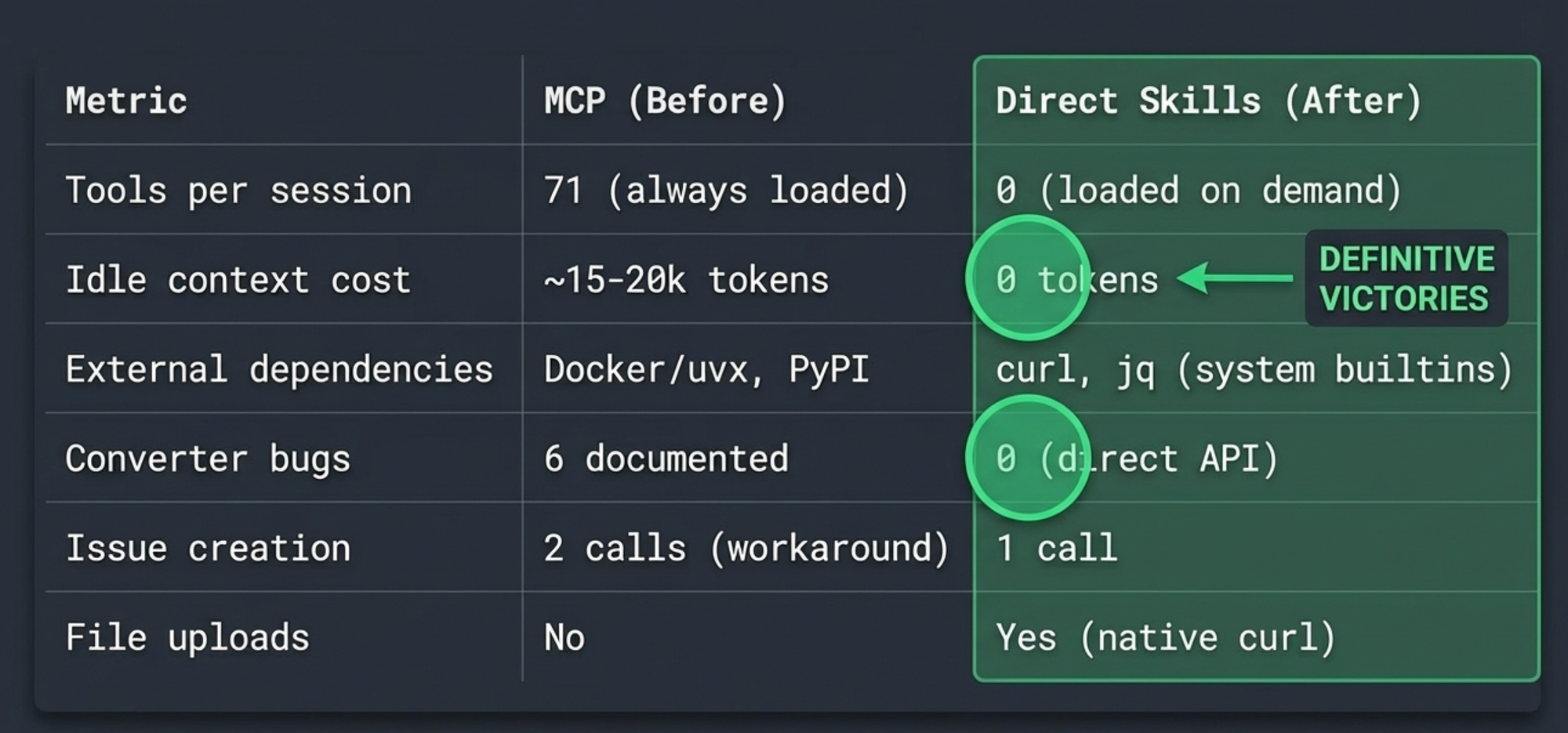 The zero idle cost is the headline number. Skills load on demand – if a session doesn't touch Jira, zero tokens are spent on Atlassian tooling. With MCP, those 71 tool schemas were in context from session start regardless of whether you needed them.