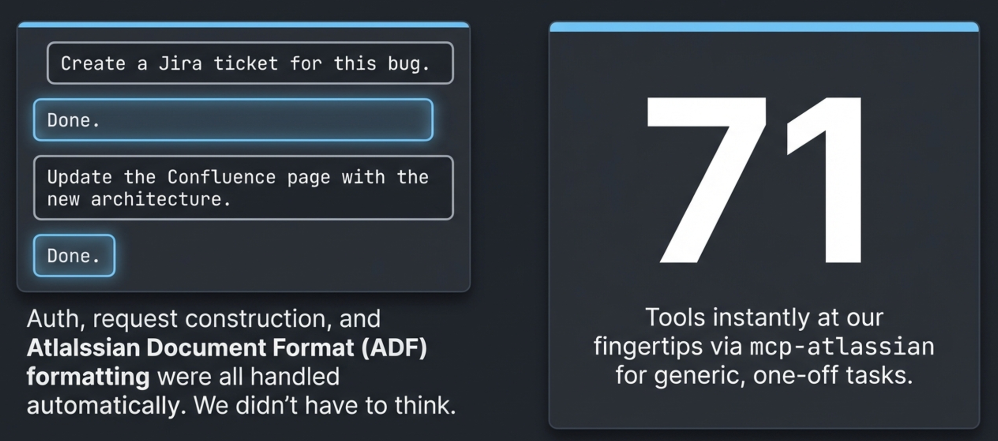 When we first wired up mcp-atlassian to Claude Code, it felt like magic. "Create a Jira ticket for this bug." Done. "Update the Confluence page with the new architecture." Done. The MCP server handled authentication, request construction, Atlassian Document Format – all the tedious plumbing that makes the Atlassian API unpleasant to use directly. We had 71 tools at our fingertips and didn't have to think about any of them.