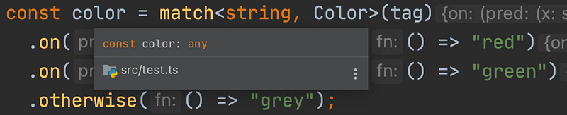 My IDE shows color as type any! This is because inferring the type of on is a recursive function. And typescript is having trouble inferring this recursive type (because on returns match, which has a member function on, then returns match, … etc.). This is the type inferred for match :on(